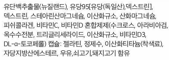 해당 건강기능식품에는 위의 성분들이 포함됩니다. 이 중 유단백추출물은 전량 뉴질랜드에서 항공직수입한 물량으로 좋은 재료를 빠르게 공수하여 재료로 사용하고 있습니다.