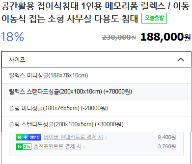 ▲ 표시된건 제일 기본 제품 가격인데요. 미니 싱글이 188,000원, 스탠다스 싱글이 258,000원, 슬림 미니가 168,000원, 슬림 스탠다드가 218,000원 입니다. 여기에 배송비 10,000원이 포함됩니다. 제가 구매한 제품은 릴렉스 스탠다드 싱글 이네요.