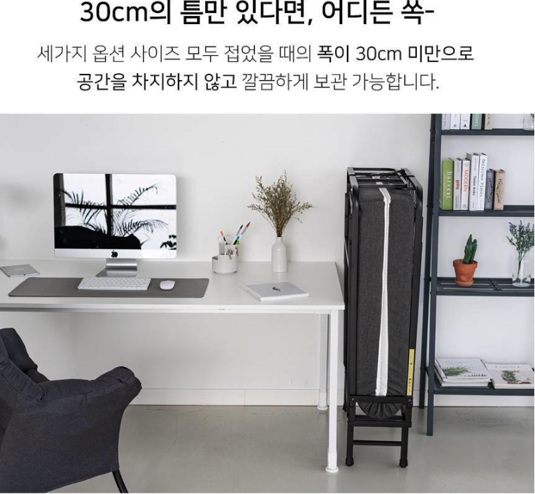 ▲ 침대를 사용하지 않거나 잠시 청소를 위해서 치워둬야 할 때 접으면 됩니다. 접게되면 두께가 약 30cm 정도 되고 잡을 곳도 많아서 쉽게 옮길 수 있습니다. 또 좁은 틈에 넣어둘 수 있어서 공간도 많이 차지하지 않습니다. 매트리스와 함께 접힌 두께가 30cm 정도라 공간 자체가 많이 필요하지 않아서 보관하기에 용이합니다.
