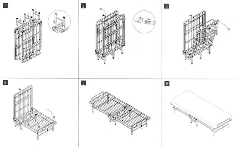 ▲ 제품을 받으면 철제 프레임에 매트리스가 장착된 상태로 배송이 됩니다. 그 상태에서 좌, 우 부분을 고정한 벨트가 있는 부분을 바닥에 놓고 동봉된 다리 3개를 고정시킵니다. (벨트 반대 부분이 침대 중간 지지대) 그 후 다리 부분을 바닥에 놓고 좌우 고정 벨트를 풀면 침대가 펴지면서 다리가 내려옵니다. 그럼 설치가 완료되어 바로 사용할 수 있습니다.